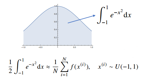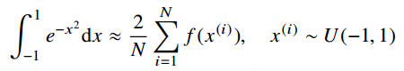 균등분포이므로 구간 [-1, 1]의 길이는 2이므로 적분값을 2로 나누면 기대값을 계산하는 것과 같으므로 몬테카를로 방법을 사용할 수 있다.