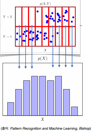 주변확률분포 P(x)는 결합분포 P(x, y)에서 유도 가능하다.
