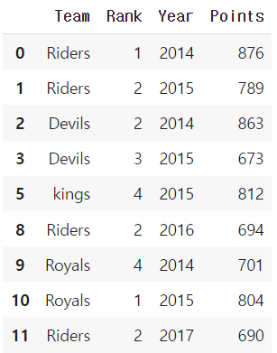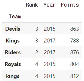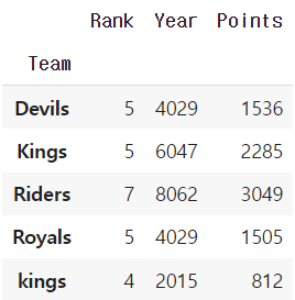 ipl_data = {'Team': ['Riders', 'Riders', 'Devils', 'Devils', 'Kings',