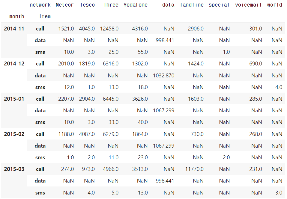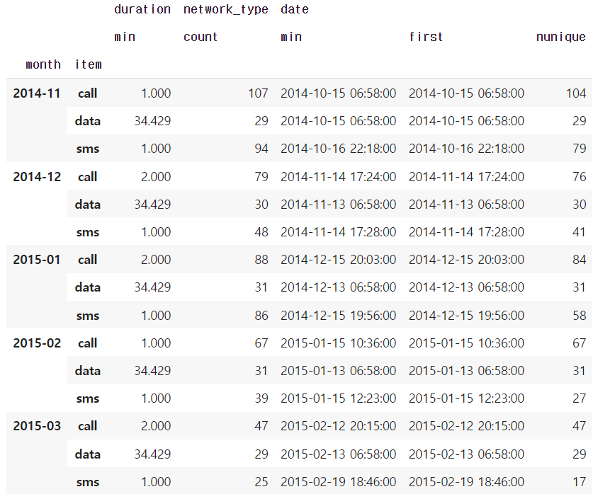 - 시간과 데이터 종류가 정리된 통화량 데이터